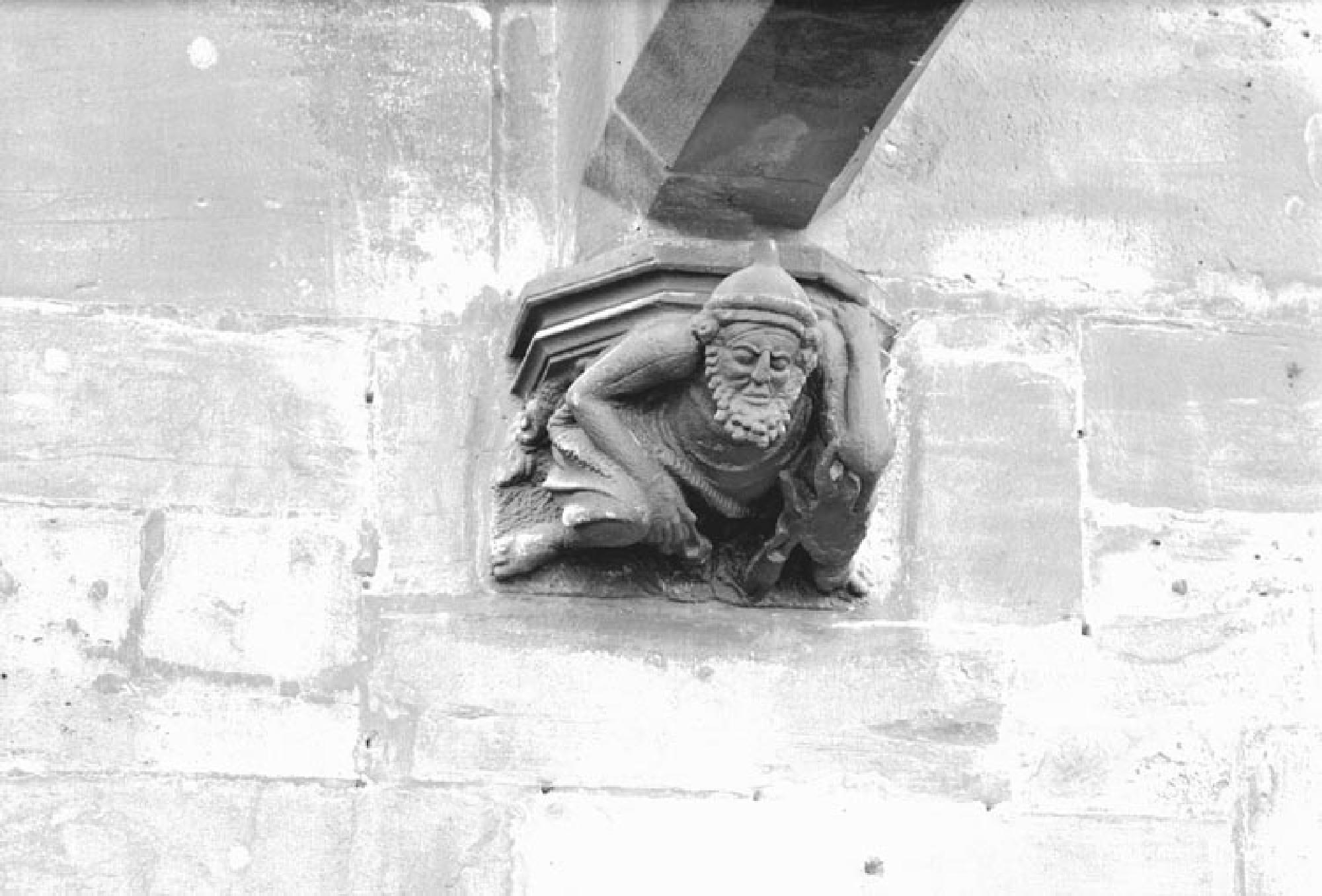 Figur eines knienden Mannes mit Judenhut an der Konsole unterhalb des Strebebogens 1/2 Nord - Mittelschiff