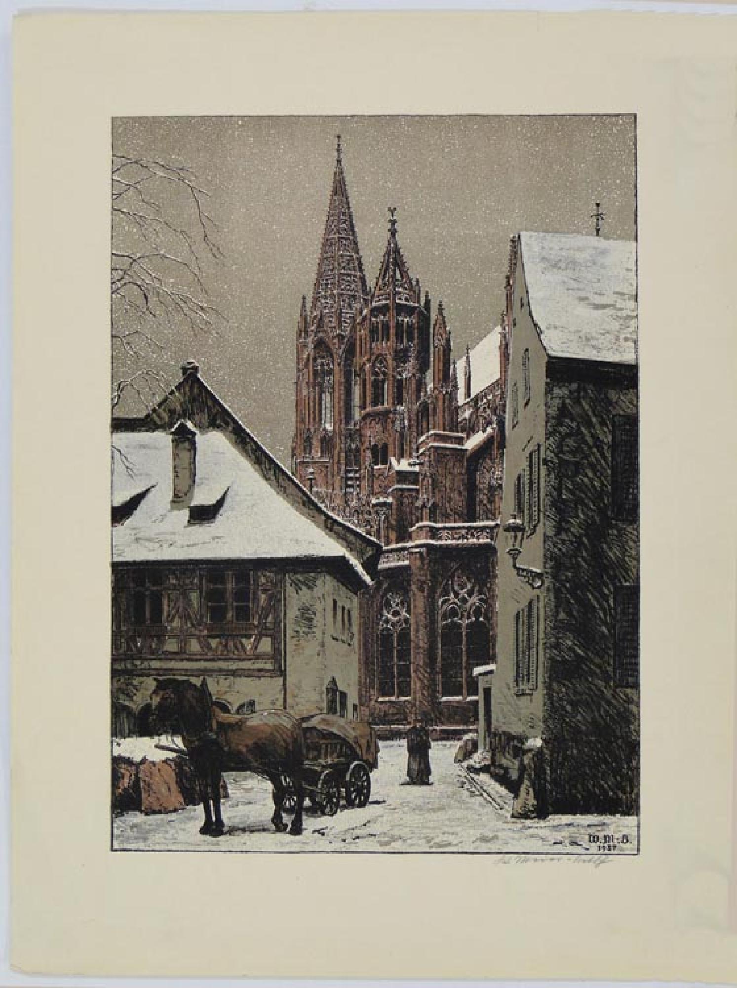 Blick von der Herrenstraße auf die Alte Münsterbauhütte und Münsterchor im Winter. Farbige Lithographie (Münster und Fachwerk in dunklem Rot, Häuser olivgrün, Dächer und Boden weiß. Im Vordergrund ein Pferdewagen mit Heu. Unten rechts: W.M.B. 1937 Maße: Bildmaß: 41 x 29,5 cm; Blattmaß: 54 x 40,5 cm. Beschriftung: W. Meier-Bitsch (Bleistift, handschriftlich) Rückseite: farbige Original-Lithographie von Kunstmaler Walther Meier-Bitsch, früher Freiburg i. Brsg,Str. 26; jetzt (1948) in L, Str. 86. Blick von der Herrenstraße auf das Freiburger Münster, die Alte Münsterbauhütte, Herrenstr. 28 (am 24. Dezember 1944)