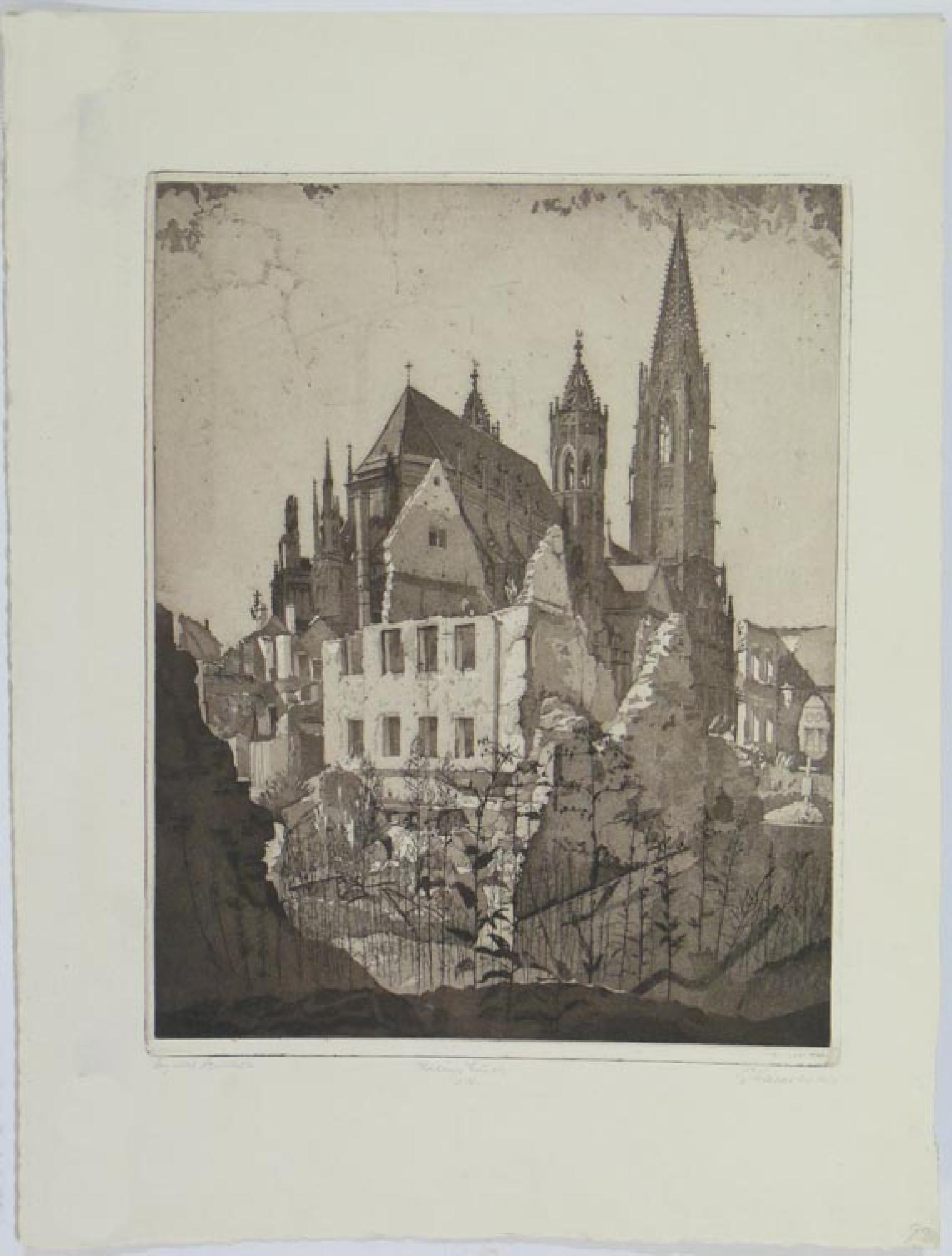 Ansicht des Freiburger Münsters von Nordosten vor den Kriegsruinen der Altstadt. Maße: Bildmaß: 36,2 x 28,8 cm; (Druck-)Rahmenmaß: 37,4 x 29,6 cm. Blattmaß: 51,5 x 38,8 cm. Beschriftung: Original Aquatinta (links): Freiburger Münster aN. (Mitte) G. Halbritter (rechts) Ecke unten rechts: 99(?) verwischte Bleistiftschrift. Rückseite: Gr-00041b
