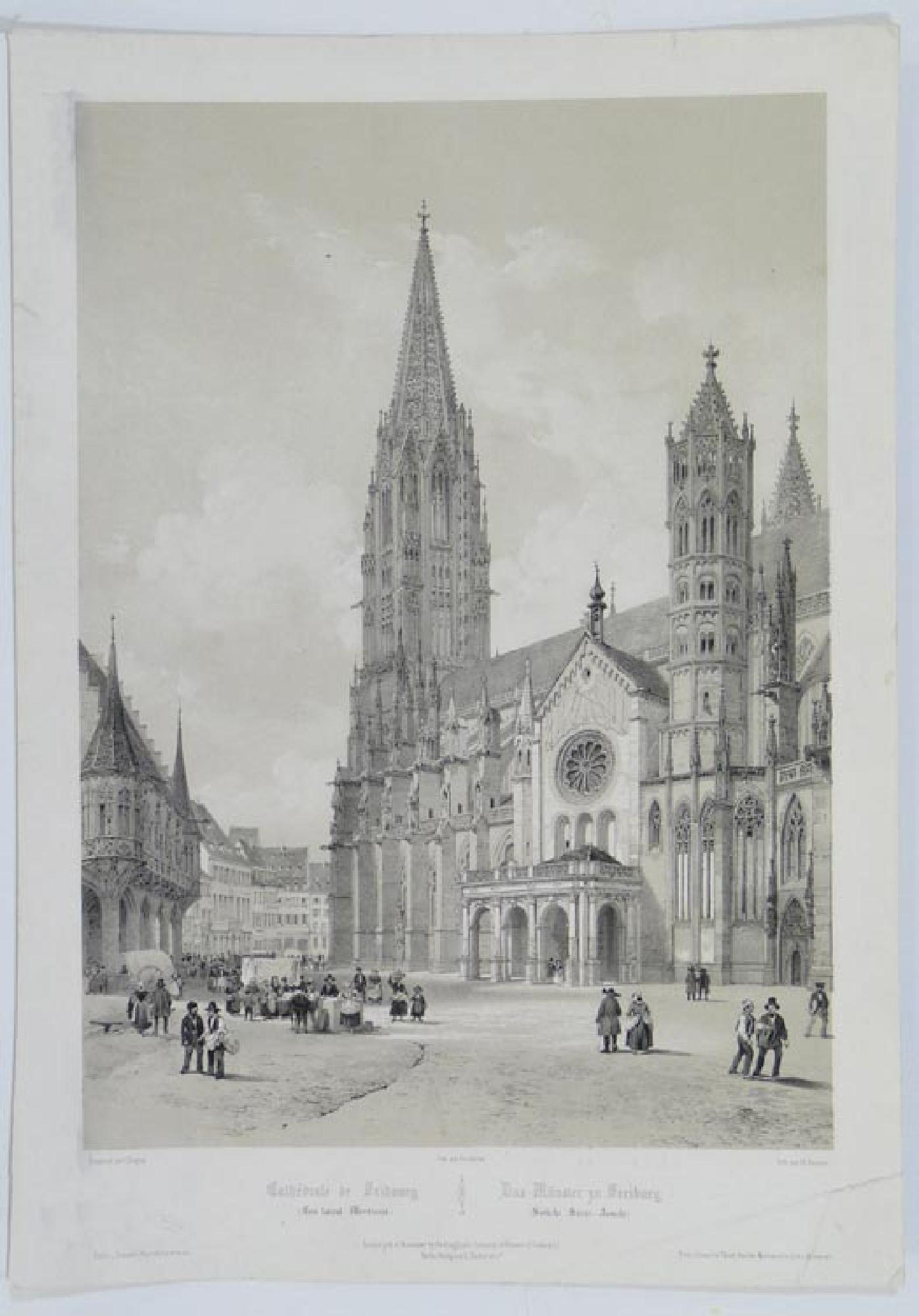 Ansicht von Langhaus, Südquerhaus und von den westlichen Chorjochen des Freiburger Münsters von Südosten. Im Vordergrund der belebte Münsterplatz mit Marktwägen. Maße: Bildmaß: 39,2 x 28 cm, Blattmaß: 46,7 x 33 cm Beschriftung: Bildunterschrift: Dessinè par Chapuy (links); Imp. par Lemercier (Mitte); Lith. par Ph. Benoist (rechts) Titel: Chatédrale de Fribourg (darunter: Coté latéral Méridional)// Das Münster zu Freiburg (Darunter: Südliche Seitenansicht). Dazwischen kleine, geschwungene Grafik (Kleeblätter?) darunter: 14 Paris._ Jeannin, Place du Louvre, 20 (links); London. pub 15 November by the Anaglyphic Company, 25 berners S./t Oxford S/t. Darunter: Berlin Verlaf von L. Sachsé et C/ie (Mitte); Paris_goupil et Vibert, boulev. Montmarte 15 et r. de Lancry 7. Zwei kleine Prägestempel: H. Jeannin Editeur à Paris (unten links): Coupil, Vibert & Co (?), Editeurs, à Paris. (unten rechts) Rückseite: Stempel Münsterbauverein Freiburg i.Br.