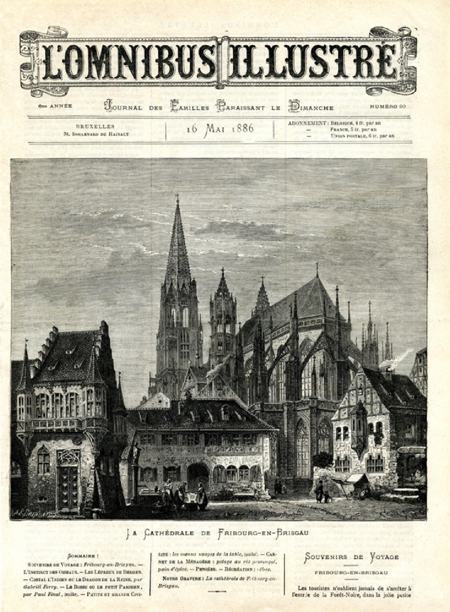 Holzstich "La Cathédrale de Fribourg en Brisgau" mit einer Südostansicht des Münsters und der Alten Bauhütte von der Schoferstraße als Auftragsarbeit für die belgische Zeitschrift "L'Omnibus Illustré" am 16. Mai 1886, die über Belgien hinaus kaum Abbonnenten hatte und daher ein seltenes Exemplar ist.