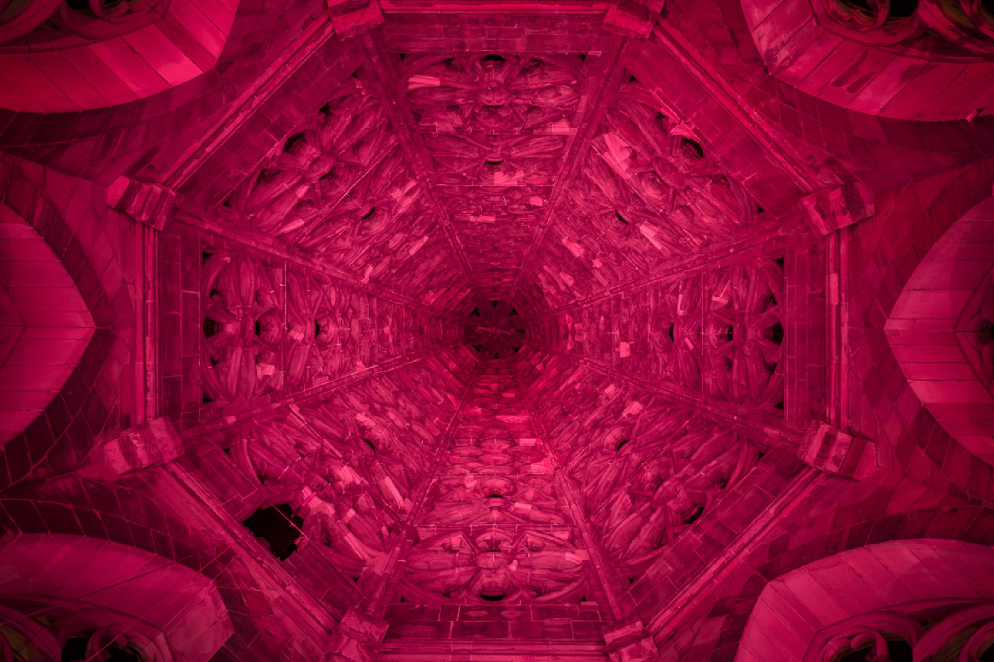 Verschiedenfarbige Beleuchtung der Hauptturmpyramide anlässlich des Turmfinales nach abgeschlossener Sanierung des Haupturms.
