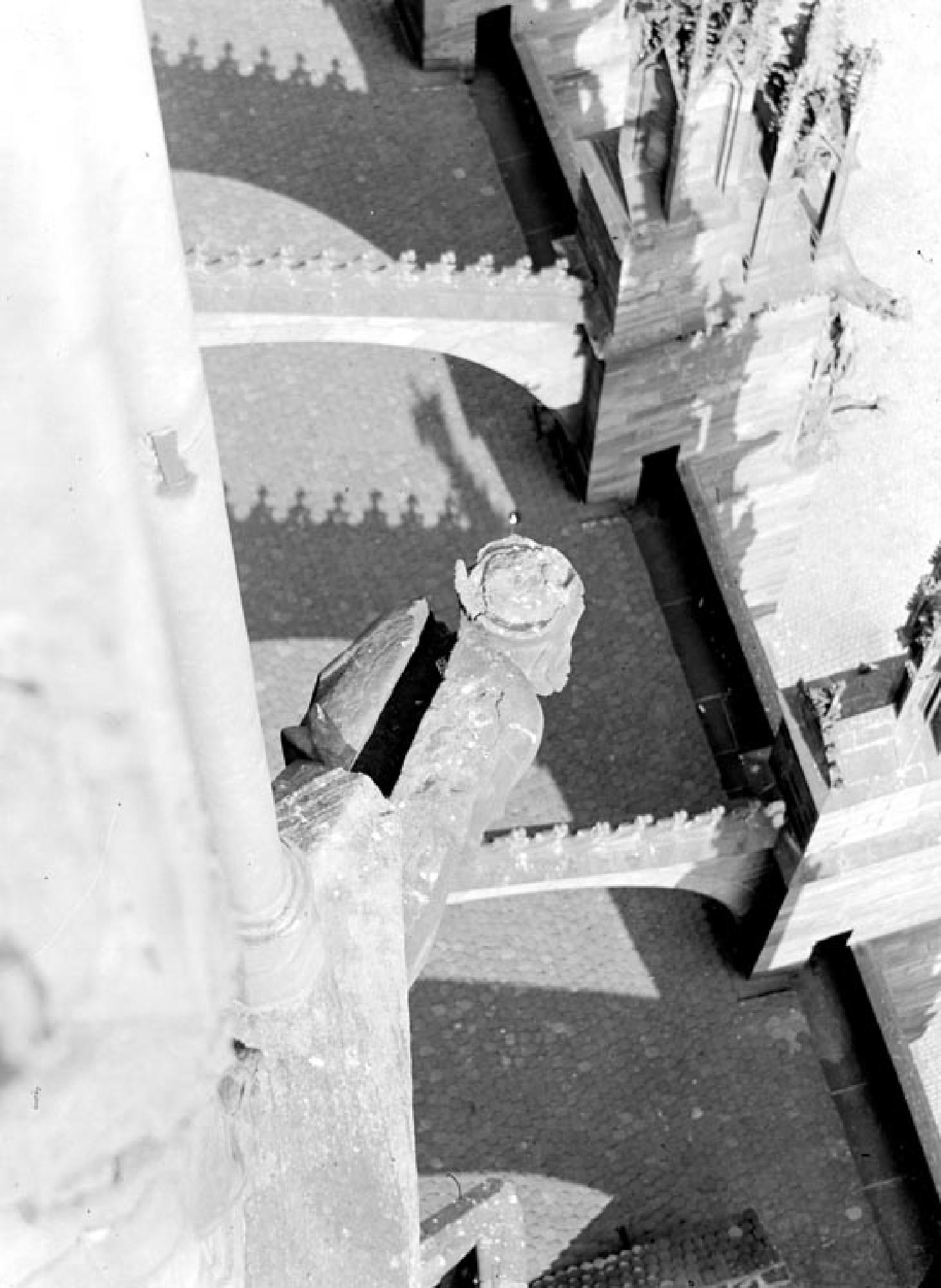 Ansicht von oben auf dem Wasserspeier. Besonders gut zu erkennen ist die Wasserrinne und ein Teil der Kopfbedeckung. Am Rücken fallen mehrere Schäden wie Abschalung oder Risse auf. Unter dem Wasserspeier ist das südliche Seitenschiffdach mit den Strebebögen der einzelnen Strebepfeiler zu sehen.