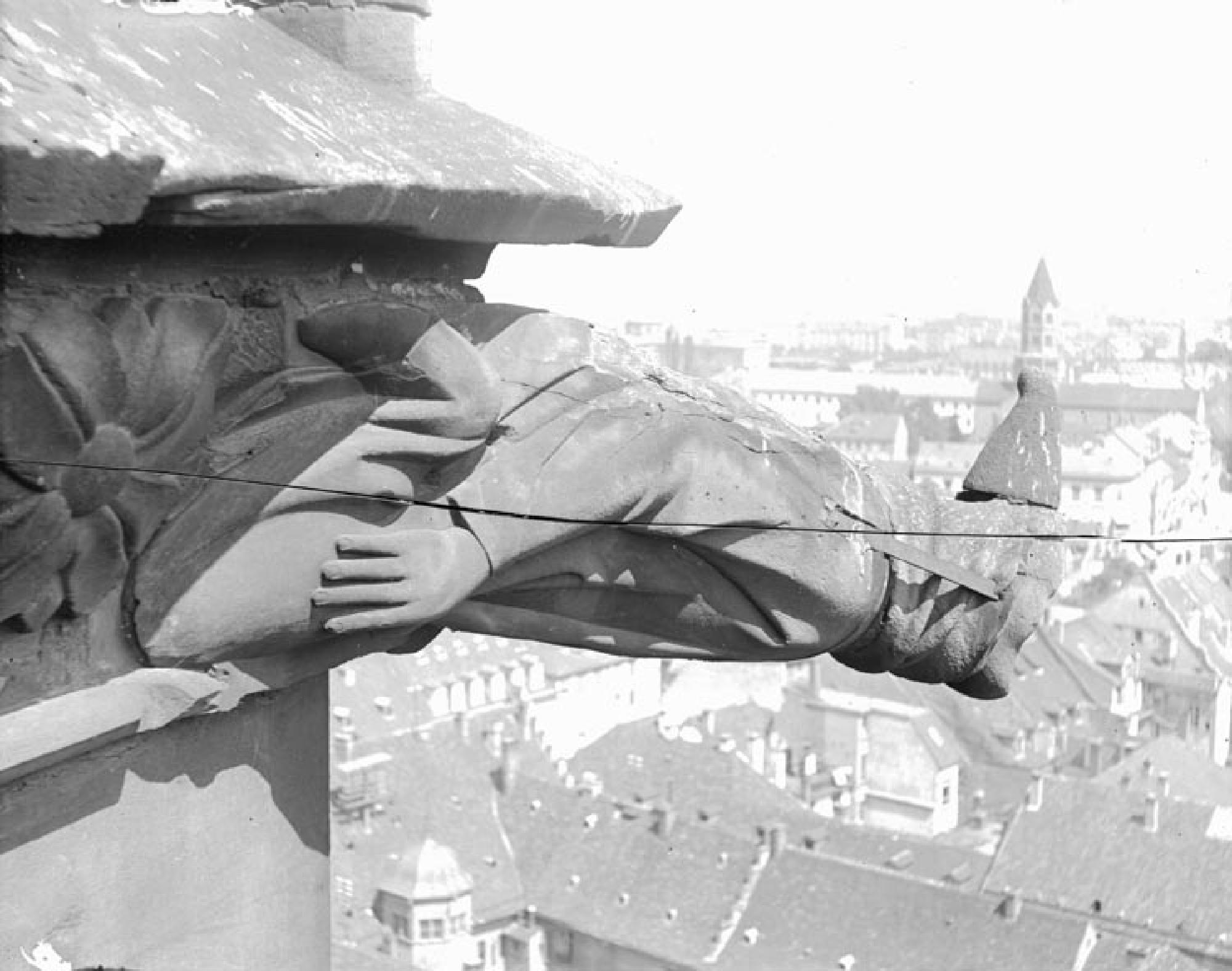 Ansicht auf die rechte Seite des Wasserspeiers. Mit dem linken Bein kniet die Figur auf dem Blattfries des Dreikantpfeilers, die Hand liegt locker auf dem Oberschenkel. Sie trägt ein langes Gewand mit hohem Kragen und Halskrause, sowie einen spitzen Hut. Der Kopf ist mit Eisen an der Figur gesichert. Am Rücken des Wasserspeiers sind außerdem Abschalung und verschiedene Risse festzustellen.