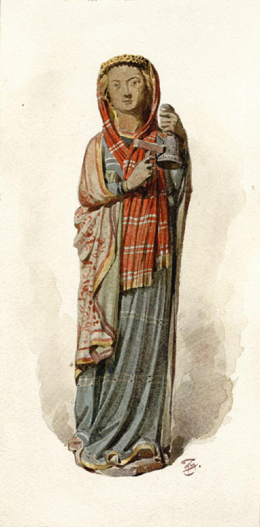 Die zwischen 1887 und 1889 entstandenen Aquarelle von Fritz Geiges dokumentieren die Farbfassung von 1604 der Skulpturen in der Turmvorhalle und dienten 1889 als Vorlage für die Neufassung von Carl Schilling unter der Regie von Fritz Geiges. Diese Fassung wurde von 1999 bis 2004 restauriert und konserviert.