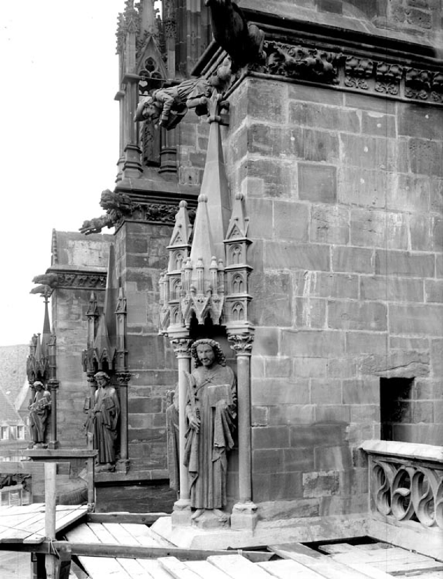 Blick auf die sanierten Figurenbaldachine des Strebepfeilers 2/3 mit dem Gerüst der Maßnahmen ab 1909 in bis zur Seitenschiffgalerie rückgebauten Zustand ab 1913. Unter dem Baldachin zu sehen die Figur von Johannes dem Evangelisten und dahinter die des Apostels Jakobus des Älteren. Auf höhe des Blatfrieses darüber zu sehen ist der neu angebrachte Wasserspeier Mann mit Buch. Im Hintergrund befinden sich die Strebepfeiler 1/2 und 0/1. Man erkennt im Vergleich sehr gut den Unterschied der verschmutzten Skulpturen zu dem in der Sanierung gereinigten Evangelisten. Strebepfeiler 1/2 Skulptur unten: Apostel, oben: Schutzmantelmadonna. Wasserspeier unten: Einhorn auf dem Rücken eines Mannes, oben: Fantasiewesen und Löwe Strebepfeiler 0/1 Skulptur: Apostel Wasserspeier unten: Hirschjagd, oben: Sau mit Ferkeln und Löwe