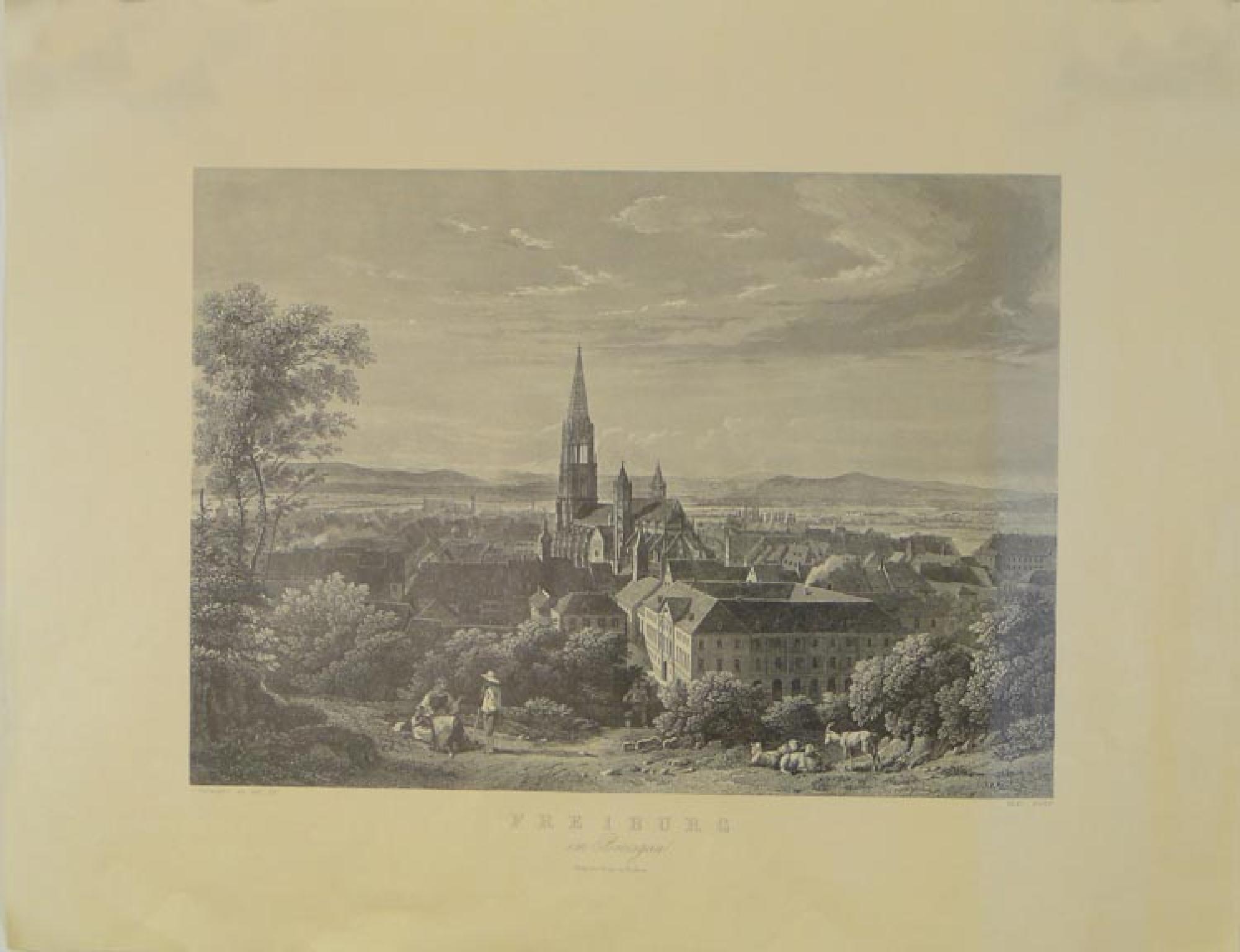 Ansicht Freiburgs vom Schloßberg aus gesehen. Im Vordergrund rastende Personen, Schafe und Ziegen. Maße: Bildmaß: 33 x 46,3 cm; Blattmaß: 51,2 x 66,1 cm Beschriftung: Bildunterschrift: C. FROMMEL AD NAT. DEL (links), GRAY SCULP (rechts) Titel: FREIBURG im Breisgau. Verlag von Herder in Freiburg Rückseite: FREIBURG VIM SCHLOSSBERG AUS Nachdruck von 300 Exemplaren aus Anlaß des 850jährigen Bestehens der Stadt Freiburg im Jahre 1970. Nach der Natur gezeichnet von Carl L. Frommel, in Stahl gestochen von Gray. Das Blatt erschien erstmals 1836 im Herderschen Kunstinstitut Freiburg. BUCHHANDLUNG HERDER FREIBURG IM BREISGAU 1969