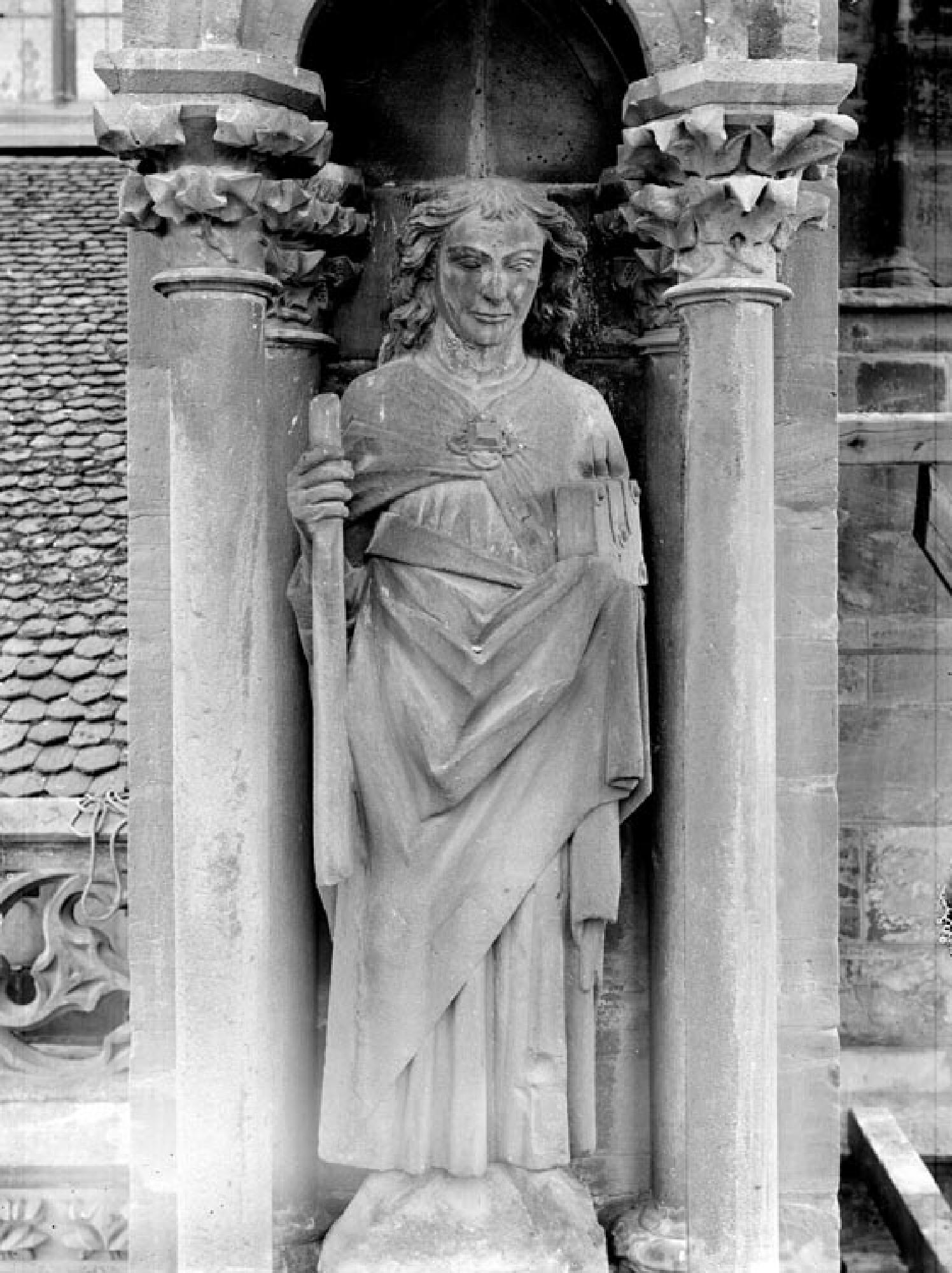 Die Apostelfigur Jakobus des Jüngeren. Ein junger Mann mit langem Haar, gekleidet in ein langes Gewand und einen Mantel. Der Mantel wird vor der Brust von einer Vierpassagraffe zusammengehalten und der rechte Saum von der linken Hand vor den Körper gerafft. In der durch den Mantel verdeckten linken Hand hält die Figur ein geschlossenes Buch mit beschlagenem Einband. Von dem Gegenstand in der rechten fehlt unten ein Stück. Es handelt sich ursprünglich um eine Keule oder einen Walkerstab, das Erkennungsattribut Jakobus des Jüngeren. Der Baldachin ist nicht vollständig aufgenommen. Zu sehen ist ein Teil des Wimpergs und die tragenden Säulen mit den vier Blattkapitelle. Alle Kapitelle geben verschiedene Pflanzen wieder. Es finden sich zum Beispiel Efeu (vorne links) und Wein (hinten links). Rechts neben dem Figurengehäuse sind Holzbalken zu erkennen, die zu einem Baugerüst am Strebepfeiler 0/0 gehören.