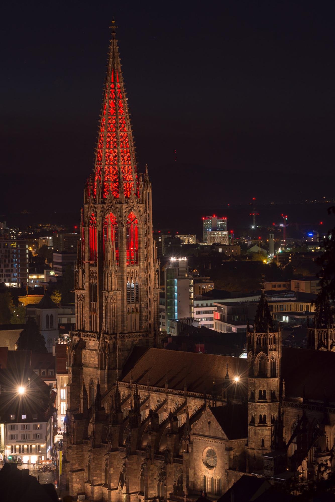 Verschiedenfarbige Beleuchtung der Hauptturmpyramide anlässlich des Turmfinales nach abgeschlossener Sanierung des Haupturms.