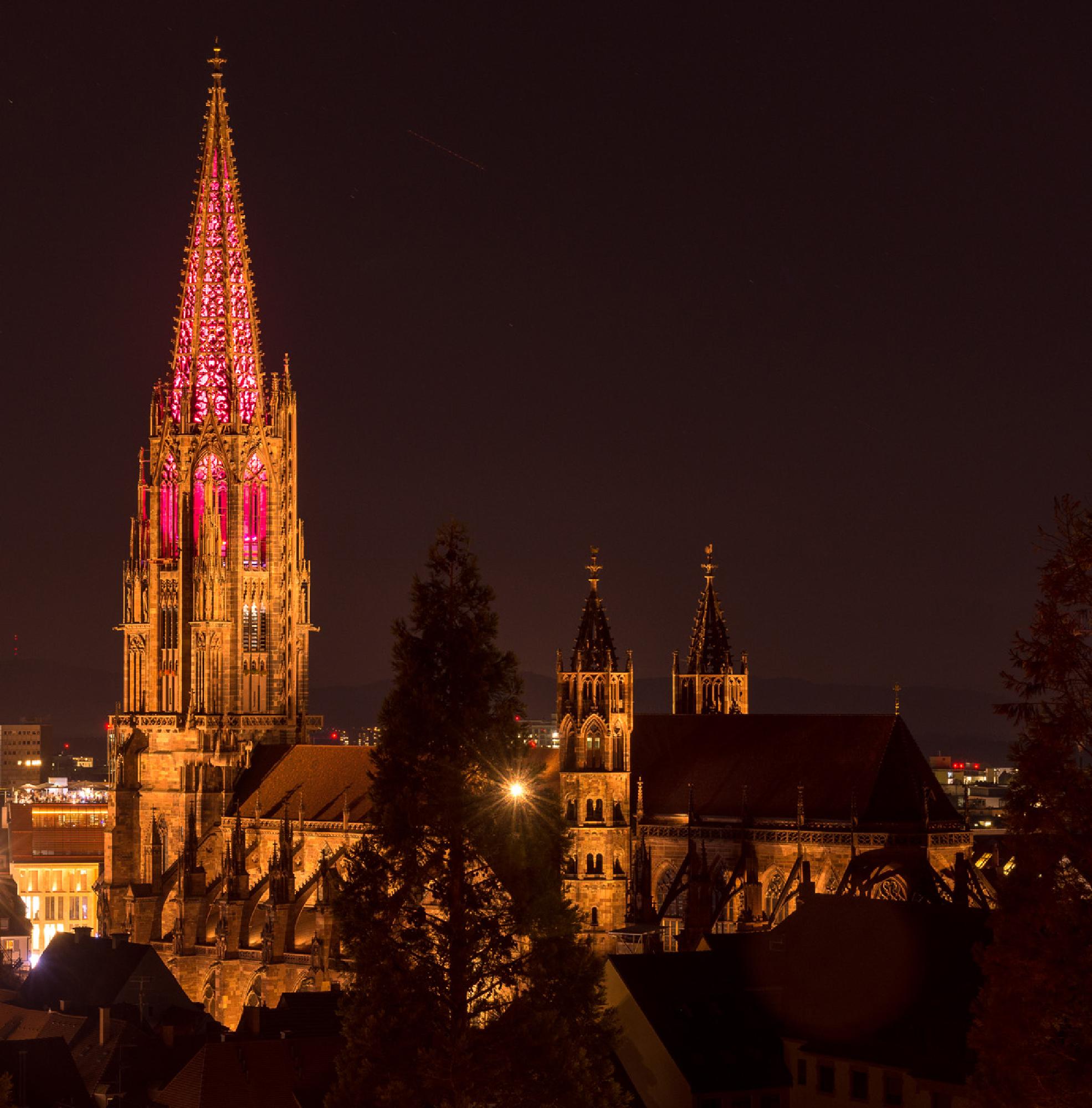 Verschiedenfarbige Beleuchtung der Hauptturmpyramide anlässlich des Turmfinales nach abgeschlossener Sanierung des Haupturms.