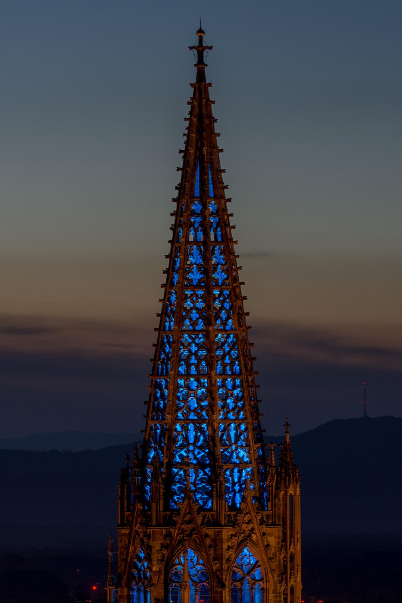 Verschiedenfarbige Beleuchtung der Hauptturmpyramide anlässlich des Turmfinales nach abgeschlossener Sanierung des Haupturms.