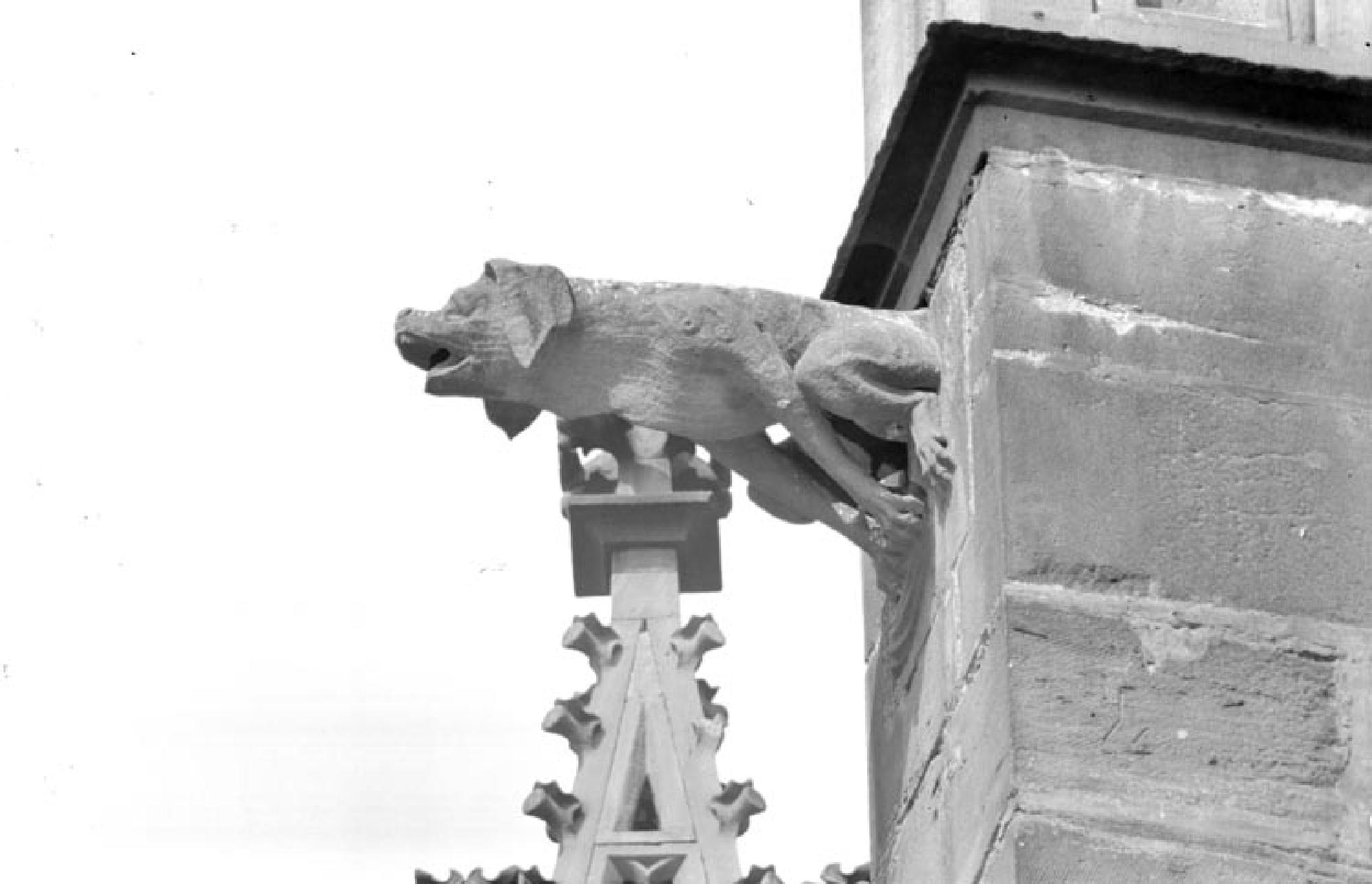 Der Hund ist als Wasserspeier sehr verbreitet. In der Bibel wird der Hund gleichgesetzt mit "den Unzüchtigen, Mördern, Götzen dienern und Lügnern", denen der Eintritt in das Paradies verwehrt bleibt. Das Foto erscheint in den Freiburger Münsterblättern 1907 (3. Jg., 1. Heft) im Aufsatz "Die Wasserspeier am Freiburger Münster" von Dr. Fritz Baumgarten.