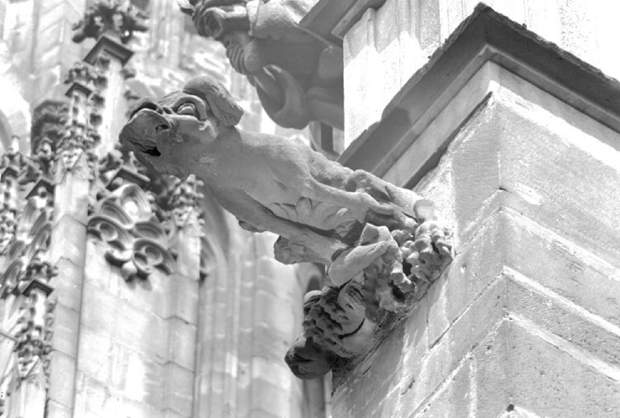 Ansicht von schräg unten auf einen zweiteiligen Wasserspeier. Der obere Teil besteht aus einer sitzenden Tiergestalt mit hornartigen Ohren, tief am Kopf liegenden Augen unt einer Hundeschnauze. Auf seiner rechten Seite sitzt hinter seinem Vorderlauf ein Vogel. Der Figur fehlt der gesamte Unterkiefer. Der untere Teil besteht aus drei raubvogelartigen, kantigen Klauen. Eine davon liegt links auf dem Stein auf, die beiden anderen greifen ein Wesen, bei dem es sich vermutlich um einen Affen handelt. Es liegt verdreht in den Klauen, ein Bein am Oberkörper entlang ausgestreckt, das zweite hängt über die Klaue, die es hält. An diesem Bein fehlt der Fuß.