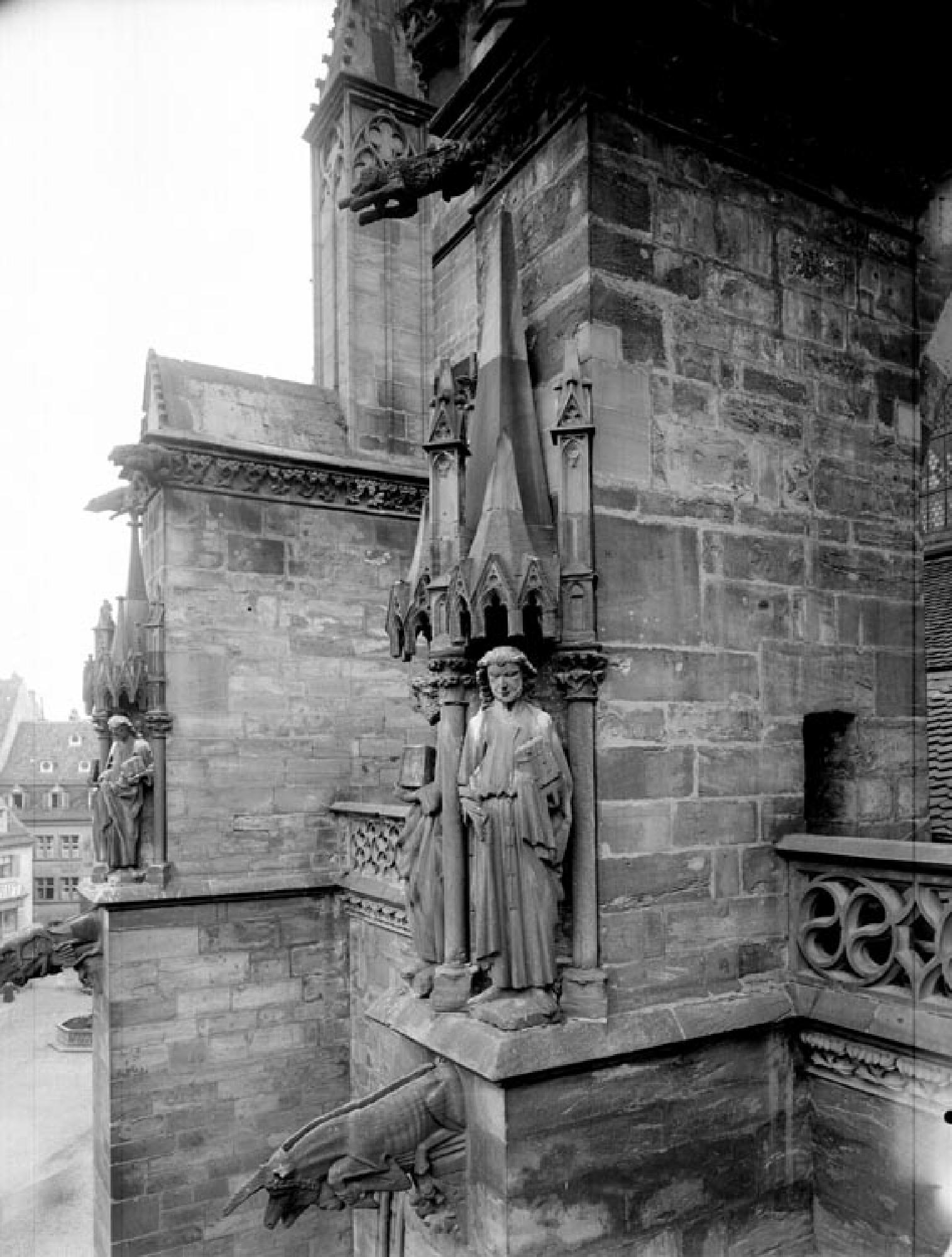 Blick von Südosten auf die Strebepfeiler 1/2 und 0/1. Die Aufnahme ist vom Gerüst der Maßnahmen an den Strebepfeilern 2/3 und 3/4 ab 1909 entstanden. An den Baldachinen sind fehlende Elemente und an den Skulpturen Verschmutzungen zu erkennen. Strebepfeiler 1/2 (vorne) Skulpturen: nicht benannte Apostel Wasserspeier unten: Einhorn auf dem Rücken eines Mannes, oben: Fantasiewesen Strebepfeiler 0/1 (hinten) Skulpturen: nicht benannte Apostel Wasserspeier unten: Hirschjagd, oben: Sau mit Ferkeln und Löwe