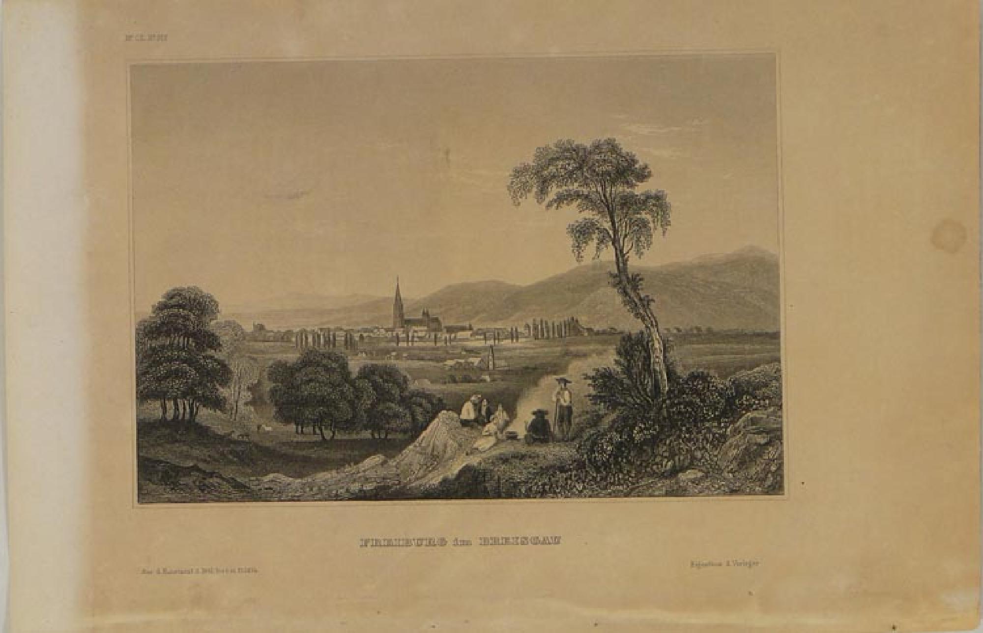 Ansicht Freiburgs von Süden. Im Vordergrund einige Personen beim Picknick. Maße: Bildmaß: 10,8 x 14,8 cm; Blattmaß: 14,8 x 22,2 cm. Beschriftung: M.s C.L.No 912 (links oben) Bildunterschrift: FREIBURG im BREISGAU Aus d. Kunstant. d. Bilbl. Inst. in Hildbh. Eigenthum d. Verleger