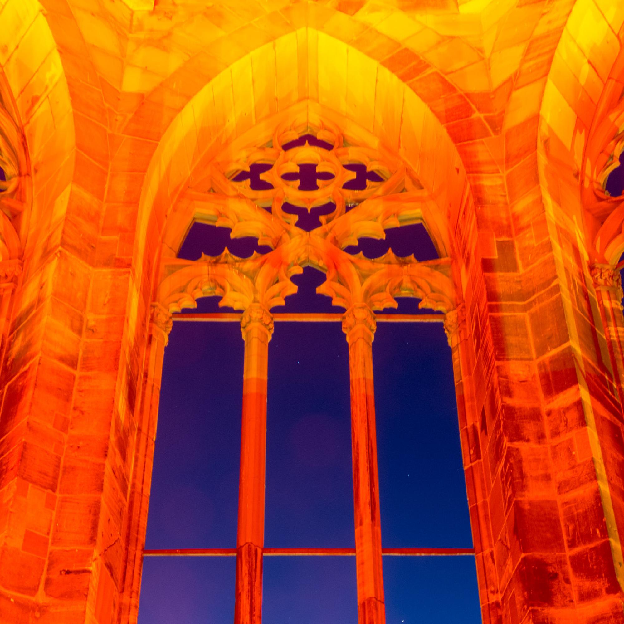 Verschiedenfarbige Beleuchtung der Hauptturmpyramide anlässlich des Turmfinales nach abgeschlossener Sanierung des Haupturms.