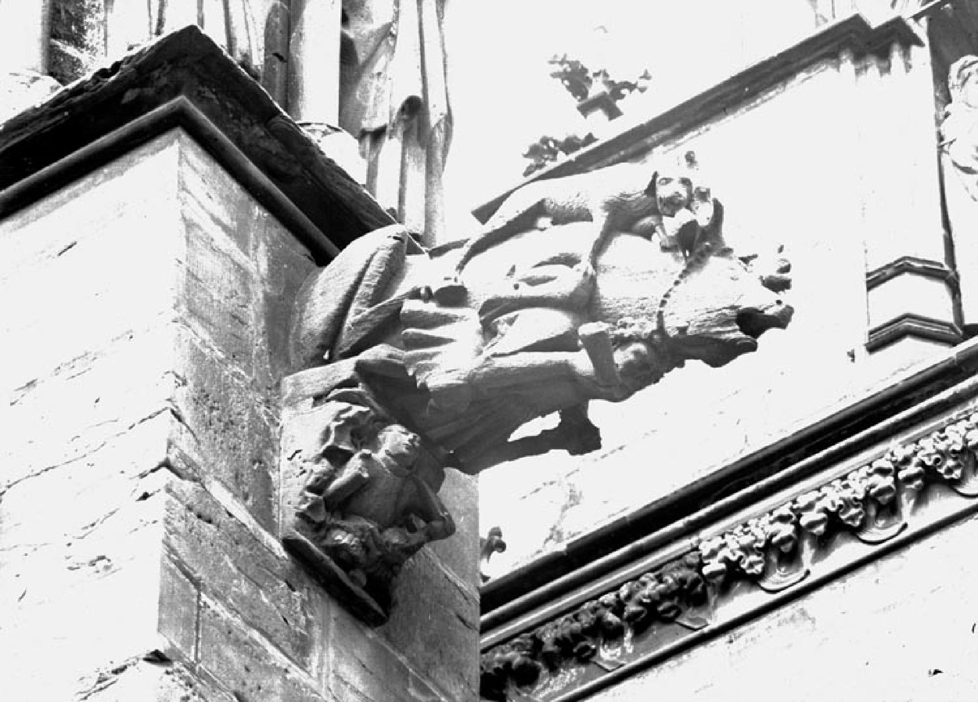 Über einer männlichen Figur, die auf einem Horn zur Jagd bläst, ragt ein Hirsch hervor, der von zwei Hunden attackiert wird. Sie haben sich auf dem Rücken des Tieres festgekrallt und in seine Ohren verbissen.