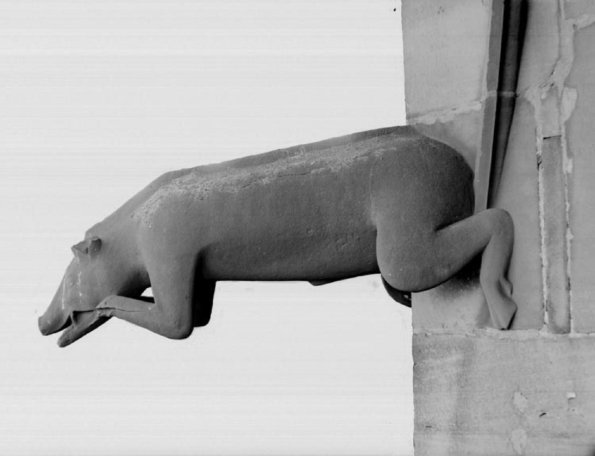 Das Schwein gehört hier zu den Darstellungen der sieben Todsünden und steht für die Unmäßigkeit. 1917 wurde die Kopie des Scheinwasserspeiers am Münster angebracht, das Original befindet sich heute im Augustinermuseum (Inv.-Nr.: S 13/M).