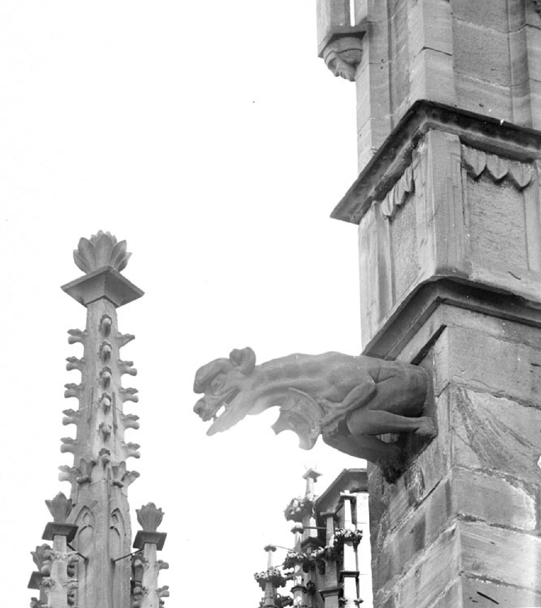 Das Foto erscheint in den Freiburger Münsterblättern 1907 (3. Jg., 1. Heft) im Aufsatz "Die Wasserspeier am Freiburger Münster" von Dr. Fritz Baumgarten.