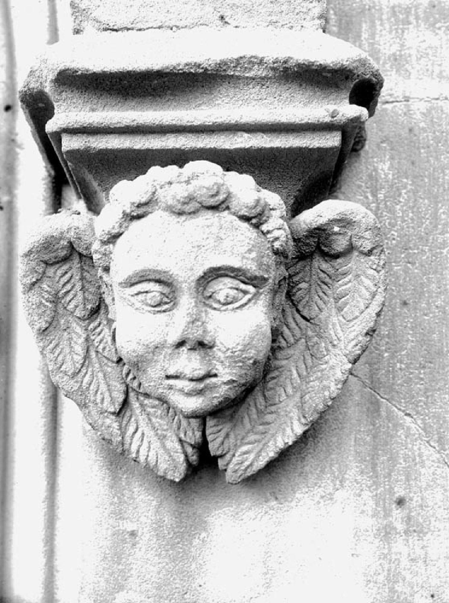 Engelskopf mit Flügeln: Konsole am rechten Außenfenster der Heilig Grab-Kapelle.