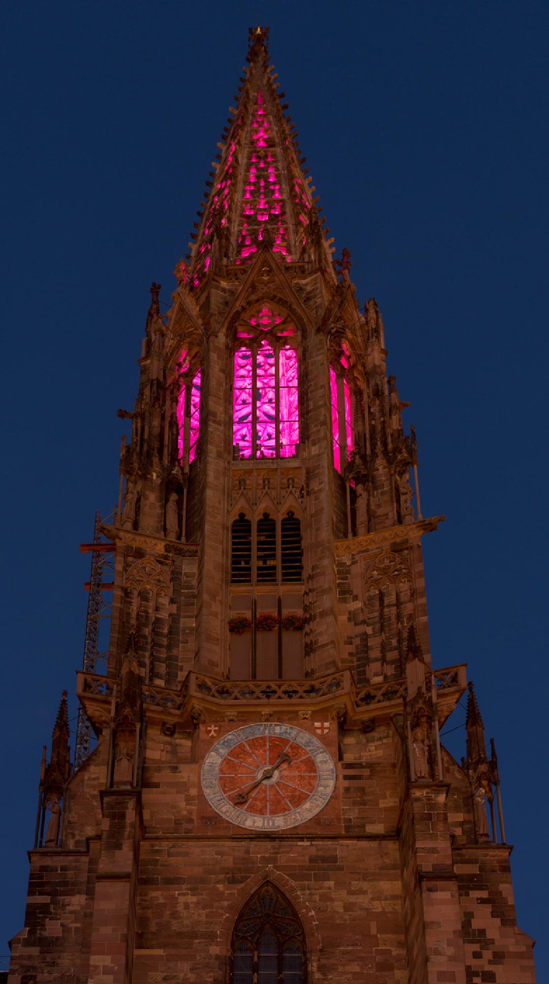 Verschiedenfarbige Beleuchtung der Hauptturmpyramide anlässlich des Turmfinales nach abgeschlossener Sanierung des Haupturms.