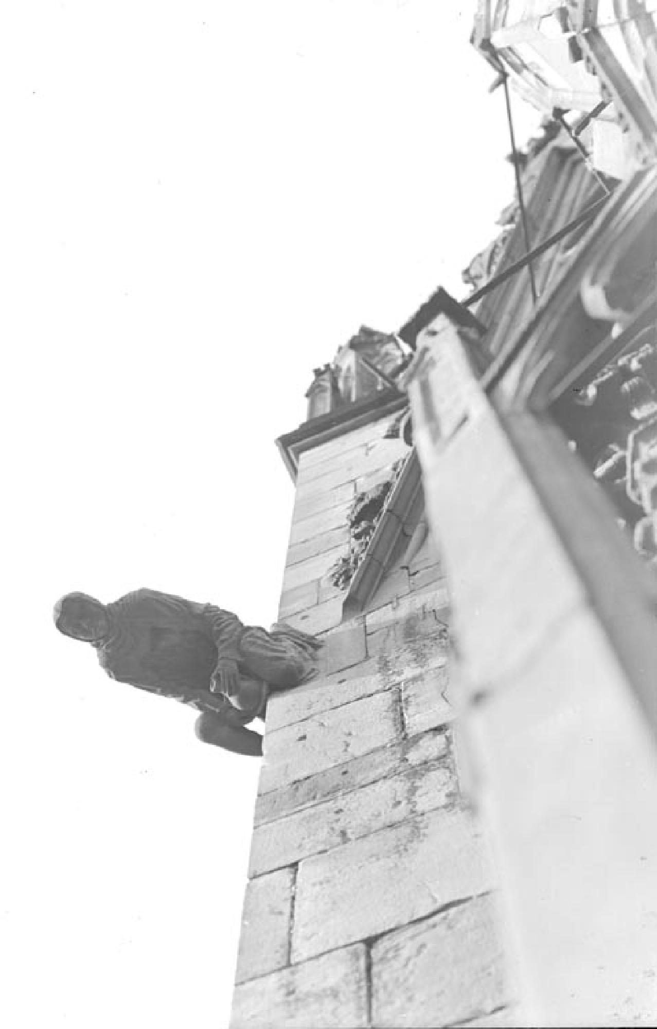Ansicht von unten auf dem Wasserspeier. Ein kniender Mann mit langem Gewand und Kapuze. Dem Faltenwurf entsprechend, bedeckt das Gewand nur das linke Bein der Figur, das rechte ist blank. Vor sich in der linken Hand hält der Mann einen Krug zwischen den Knien. Rechts ist ein Ausschnitt des Dreikantpfeilers Südwest zu sehen.