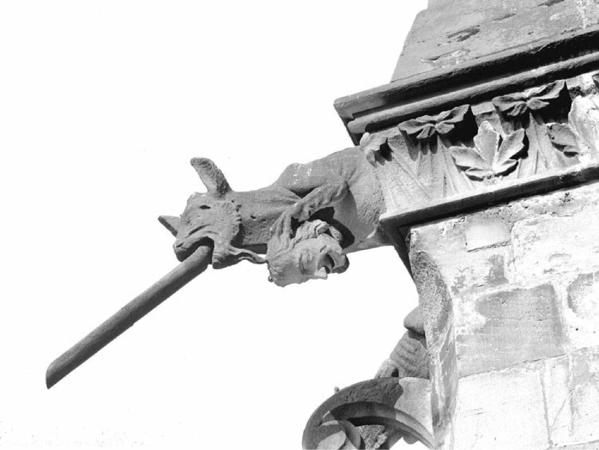 Wasserspeier Rindsähnliches Tier mit Menschenkopf zwischen den Vorderfüßen
