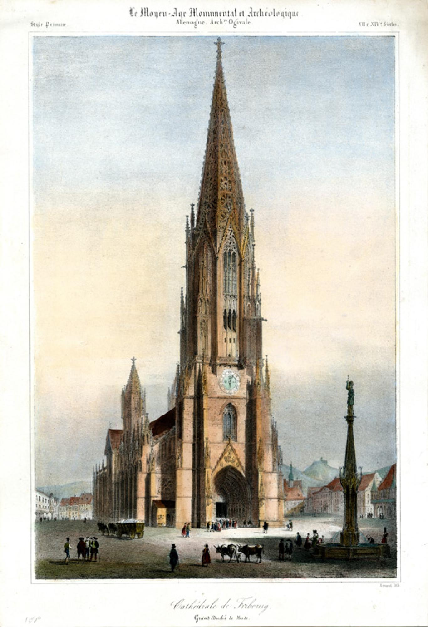 Die handkolorierte, eiweißgehöhte Lithographie "Cathédrale de Fribourg Gran Duché de Bade" von Jean Baptiste Arnout (1788-1865) zeigt eine Nordwestansicht des Münsters und wurde von Nicolas Marie Joseph (1790-1858) in " Le Moyen-Age Monumental et Archéologique, Allemagne Arch.re Ogivale" in Paris zwischen 1840-43 publiziert.