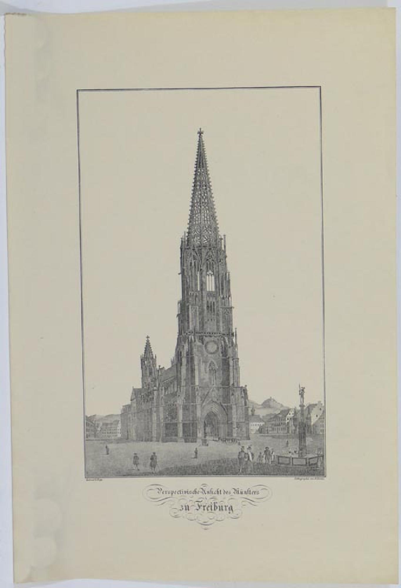 Ansicht des Freiburger Münsters von Nordwesten. Im Vordergrund der Georgsbrunnen und einige herumgehende Personen. Eine Prozession kommt aus dem Münster. Maße: Bildmaß: 34,2 x 21,3 cm, Blattmaß: 50 x 34,1 cm. Beschriftung: Gest. v. L.A. Hipp (links) , Lithographie von B. Herder Perspectivische Ansicht des Münsters zu Freiburg.