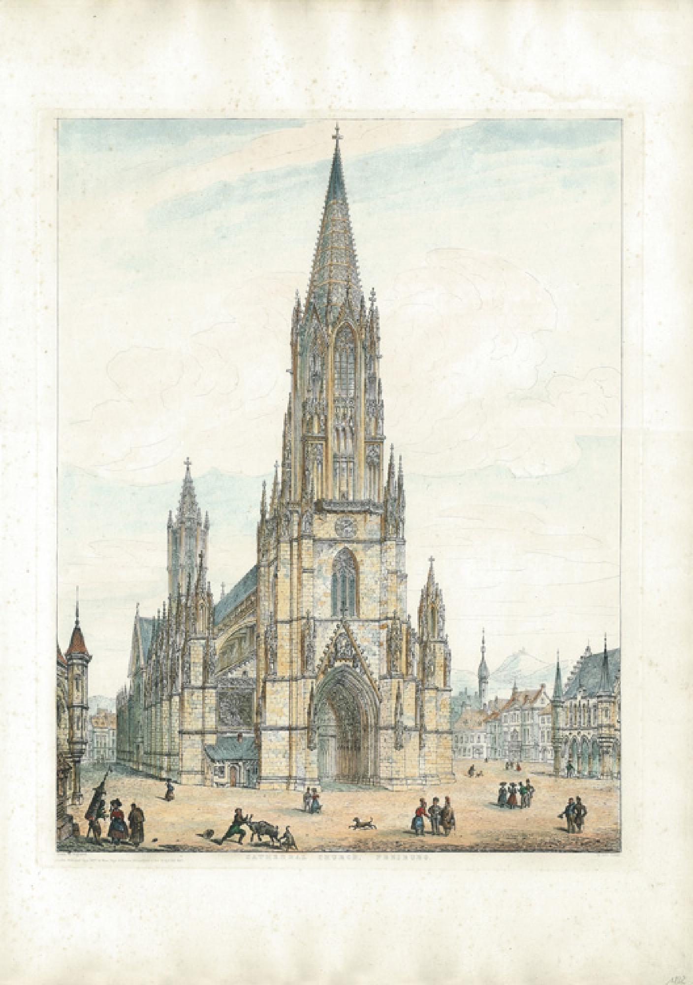 Die handkolorierte Kupferradierung "Cathedral Church, Freiburg" nach eigener Vorlage von John Coney (1786-1833), London, 1832, zeigt eine Nordwestansicht des Münsters.