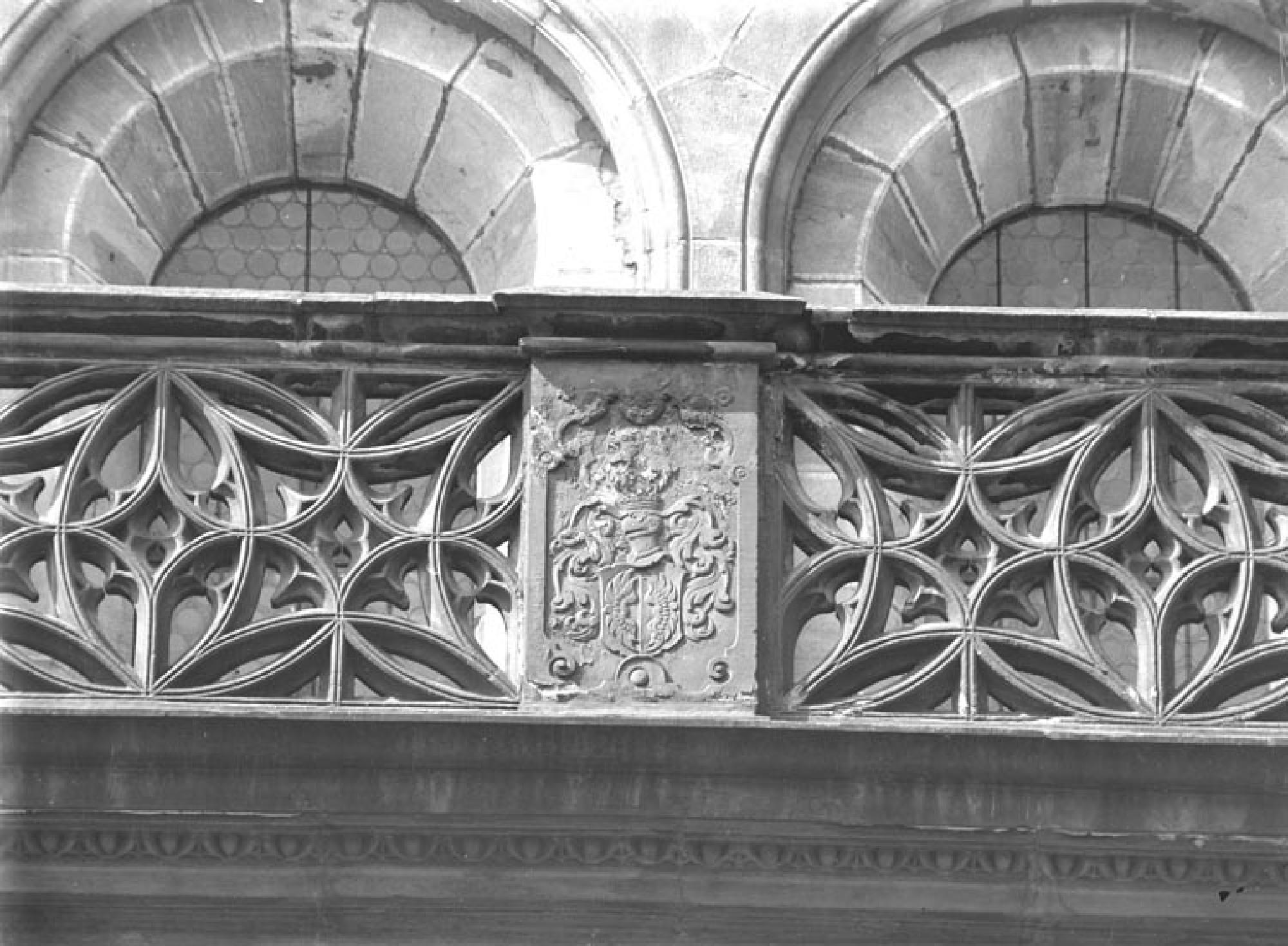 Südansicht der Renaissancevorhalle, Relief an der Maßwerkbrüstung westlich der Marienfigur.