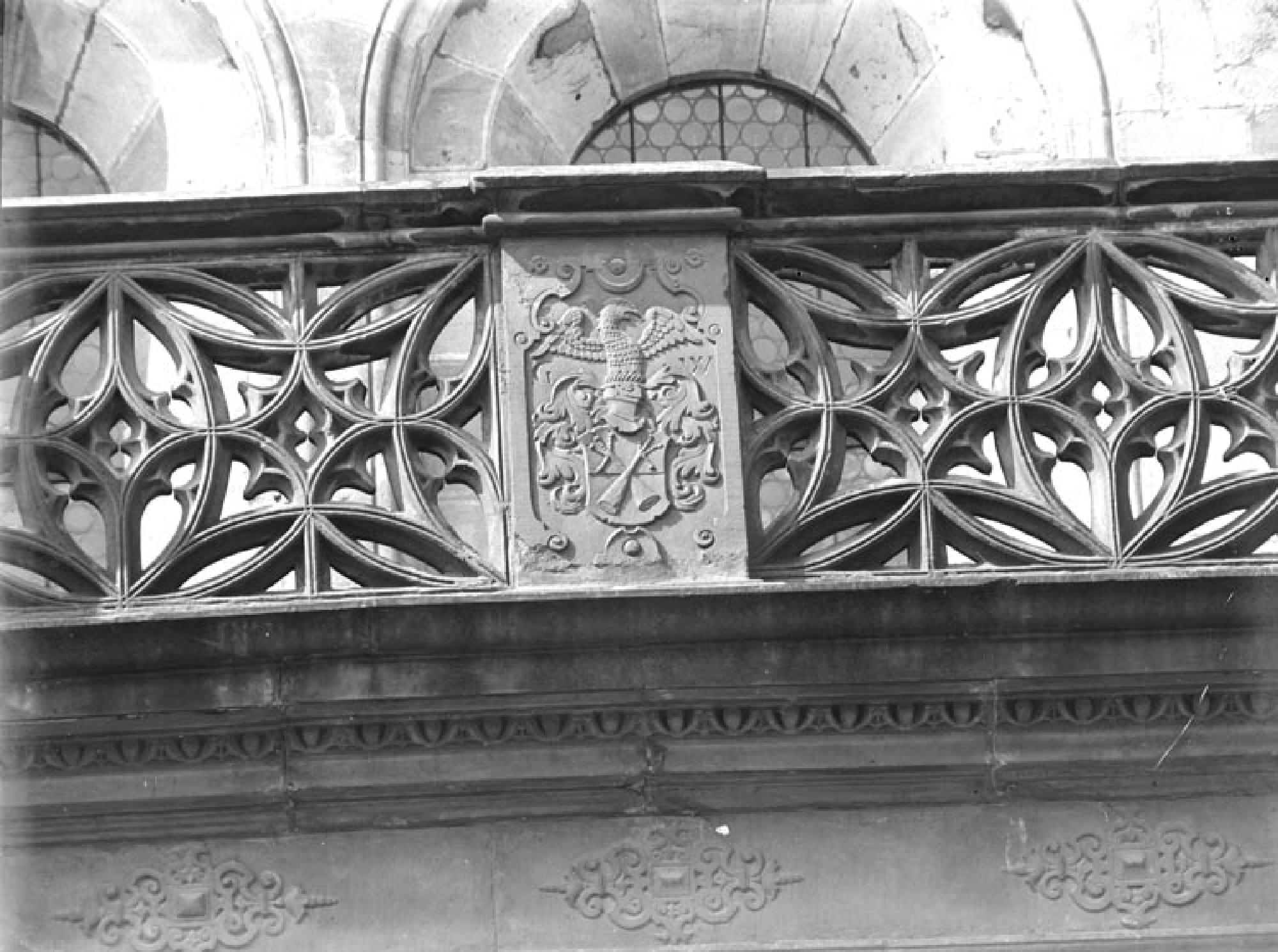 Südansicht der Renaissancevorhalle, Relief an der Maßwerkbrüstung östlich der Marienfigur.
