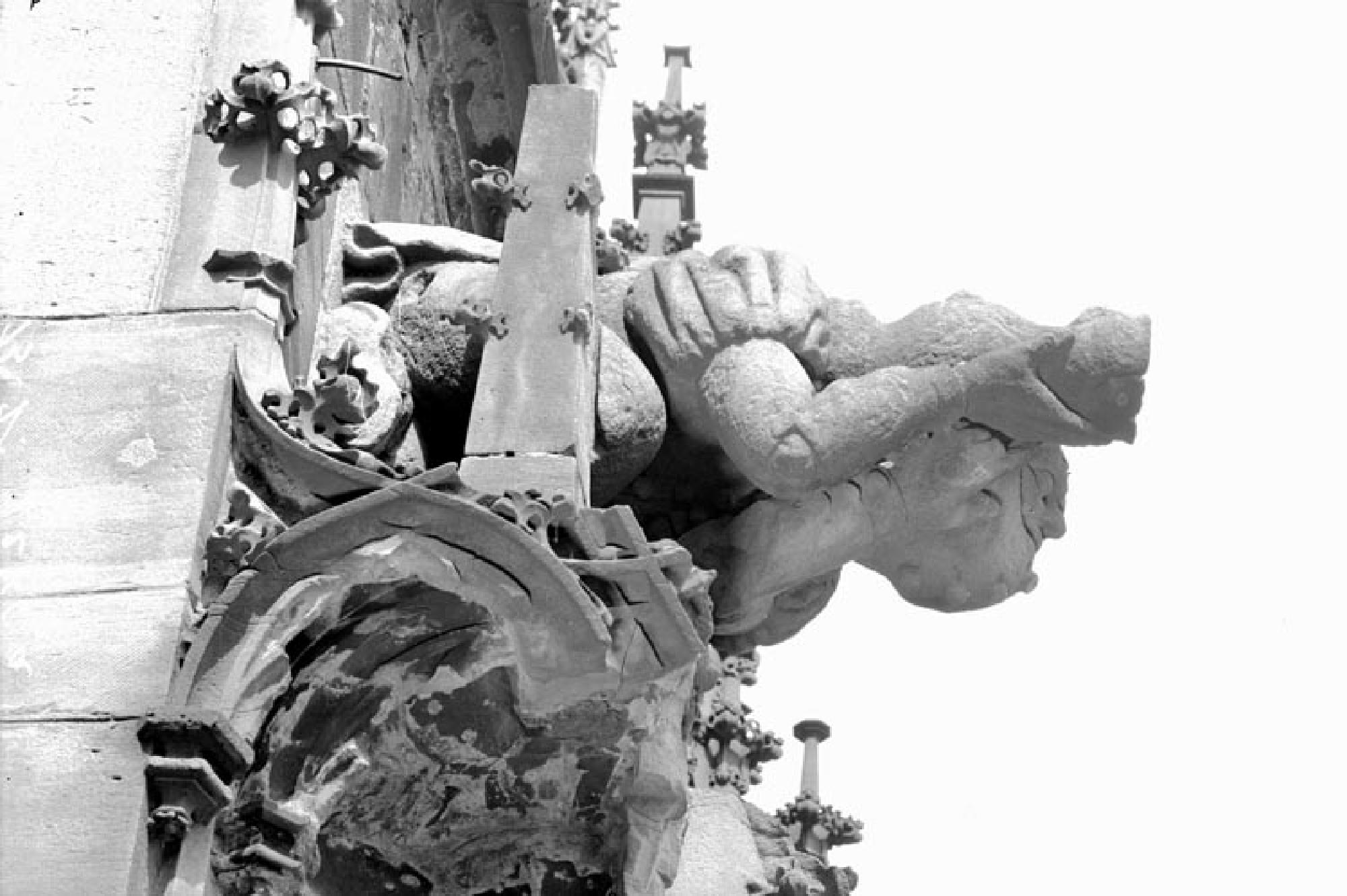 Ansicht von schräg unten auf den Baldachin des Pfeilers 11/12 und, überschnitten durch Fialen, die rechte Seite des Wasserspeiers. Eine männliche Figur, die mit beiden Armen das geschulterte Gefäß stützt, das auch als Wasserausguss dient. Sie trägt eine Narrenkappe, die bis übers Kinn geknöpft ist. Die Ärmel des Hemds sind an den Schultern gepufft und an den Handgelenken geknöpft.