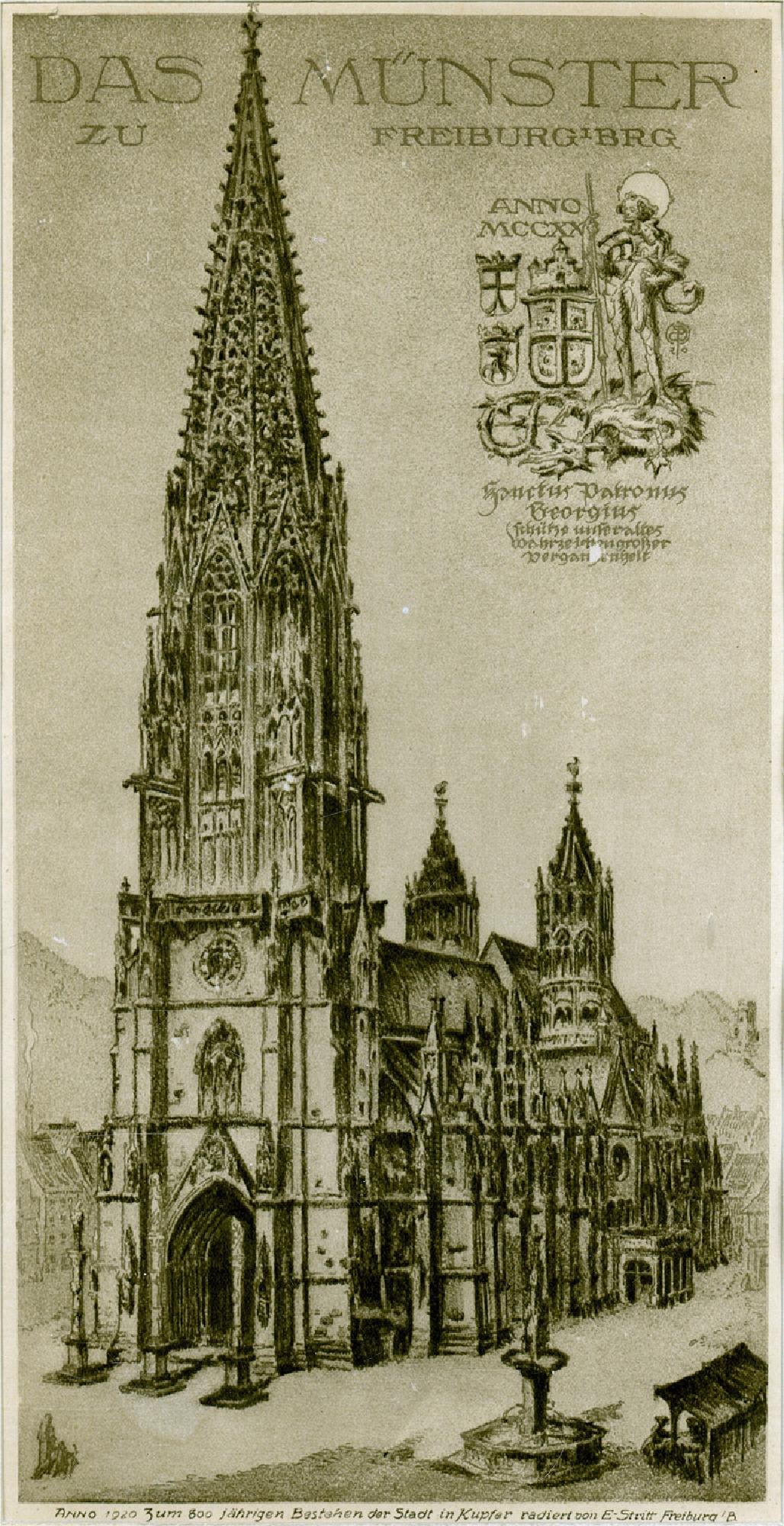 Kupferstich des Glasmalers Eduard Stritt (1870-1937). In der oberen Bildhälfte ist zu lesen: "Das Münster zu Freiburg; ANNO MCCXX; Sanctus Patronus Georgius schütze unser altes Wahrzeichen großer Vergangenheit." In der Signatur : "Anno 1920 zum 800jährigen Bestehen der Stadt in Kupfer radiert von E. Stritt"