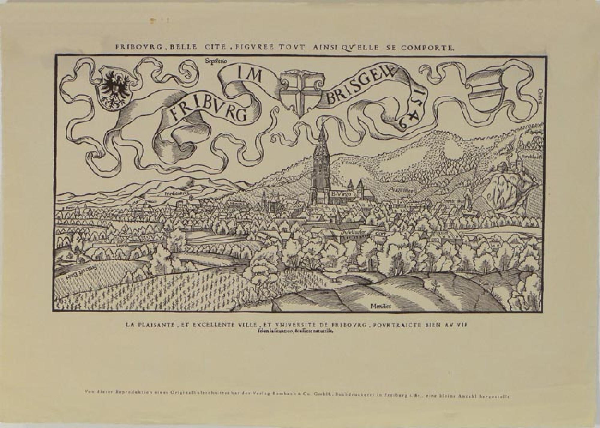 Ansicht Freiburgs von Süden. Reproduktion eines Holzschnittes aus der der" Cosmographia" von 1549. Im Vordergrund Landschaft, Weinberge, im Hintergrund hügelige Landschaft. Einige Orte und Gebäude in der Stadt sind beschriftet. Maße: Bildmaß: 18,9 x 36,1 cm (inkl. Rahmung); Blattmaß. 31,4 x 43,8 cm Beschriftung: Bildüberschrift: FRIBVORG, BELLE CITE , FIGVREE TOVT AINSI QV'ELLE SE COMPORTE Schriftband im Bild: FRIBVRG IM BRISGEW 1549 Bildunterschrift: LA PLAISANTE, ET EXELLENTE VILLE, ET UNIVERSITE DE FRIBOVRG; POVTRAICTE BIEN AV VIF felon la situation, & assiete naturelle Von dieser Reproduktion eines Originalholzschnittes hat der Verlag Rombach & Co. GmbH., Buchdruckerei in Freiburg i. Br. eine kleine Anzahl hergestellt.