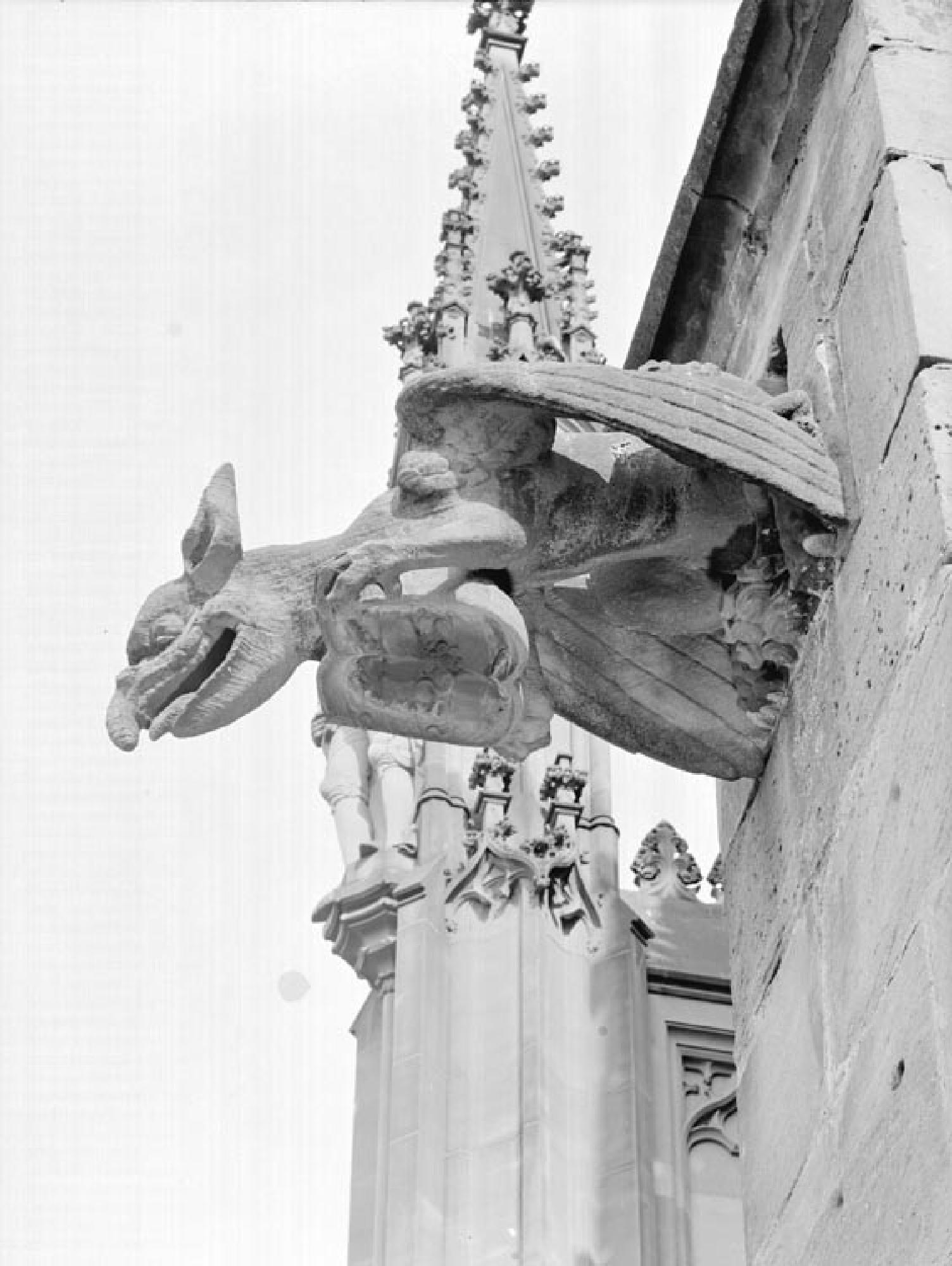 Ein Greif mit vier Beinen, gestellten Flügeln, einem langen Schwanz und großen Ohren. Zwischen den vorderen Krallen hält er ein Wappen. Der obere Teil des Schnabels ist mit einer Klammer am Wasserspeier befestigt, ansonsten lassen sich Reliefbildung und Verkrustungen erkennen.